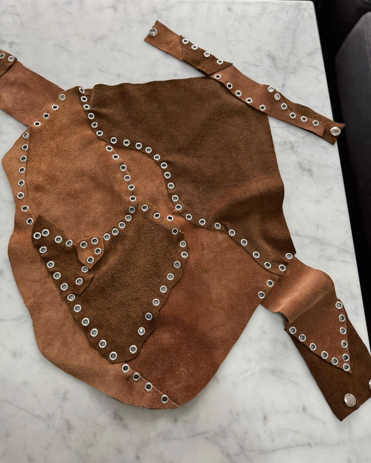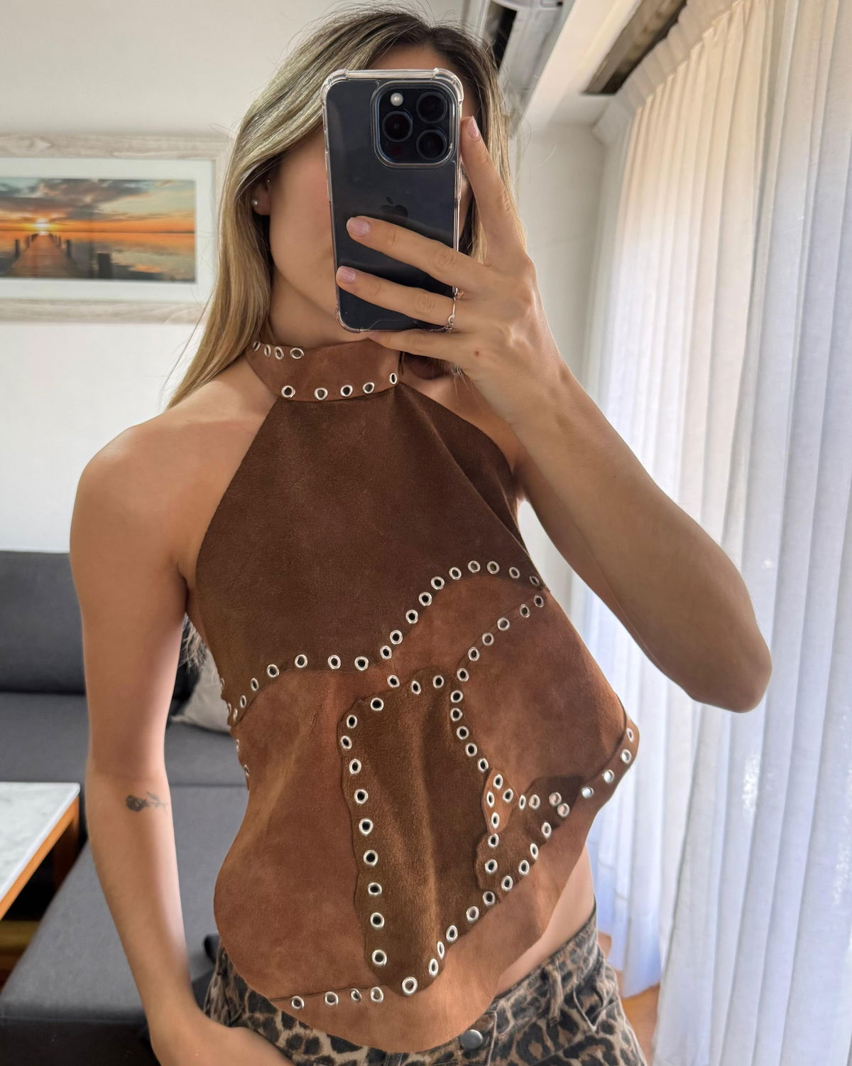 Top de cuero 100% argentino. Posee un broche en el cuello y 2 en la espalda que permiten regularlo en doble posicion.