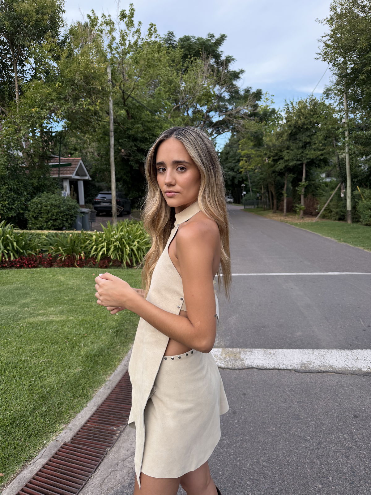 El top es asimétrico y regulable tanto en el cuello como en la espalda con hebilla.